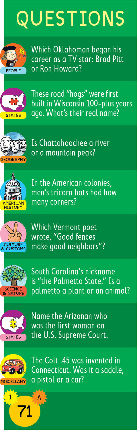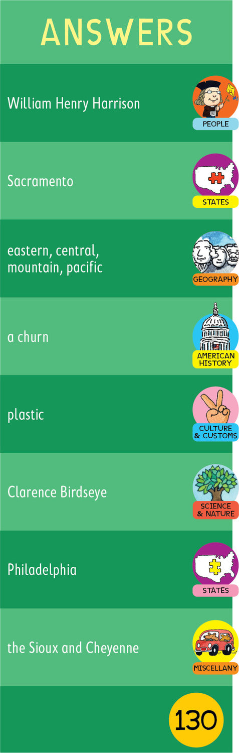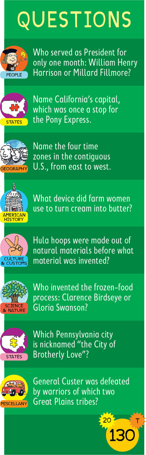 Brain Quest for the Car helps kids ages 7 –12 learn all about different American history and culture, as well as wonders of the natural world––perfect for keeping kids on the go entertained in a smart and engaging way. Covering state capitals, historical milestones, geographical oddities, and more, here is the new go-to game that makes every trip a learning adventure.