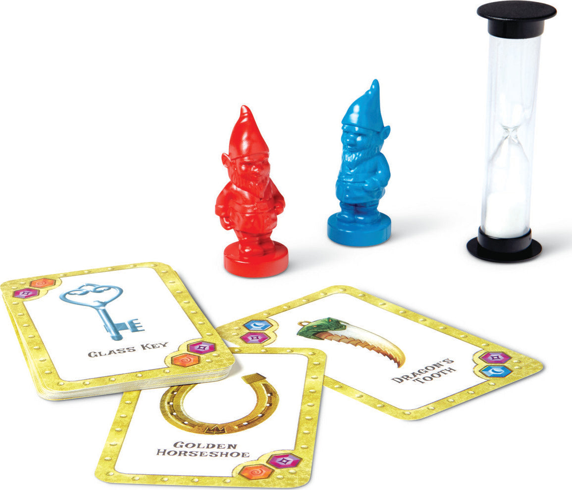 INCLUDES: 4 game boards, 12 Treasure Cards, 2 Team Cards, 4 Corner Start Cards, 2 game board holders, 2 magnetic gnome movers, 1 sand timer and instructions.