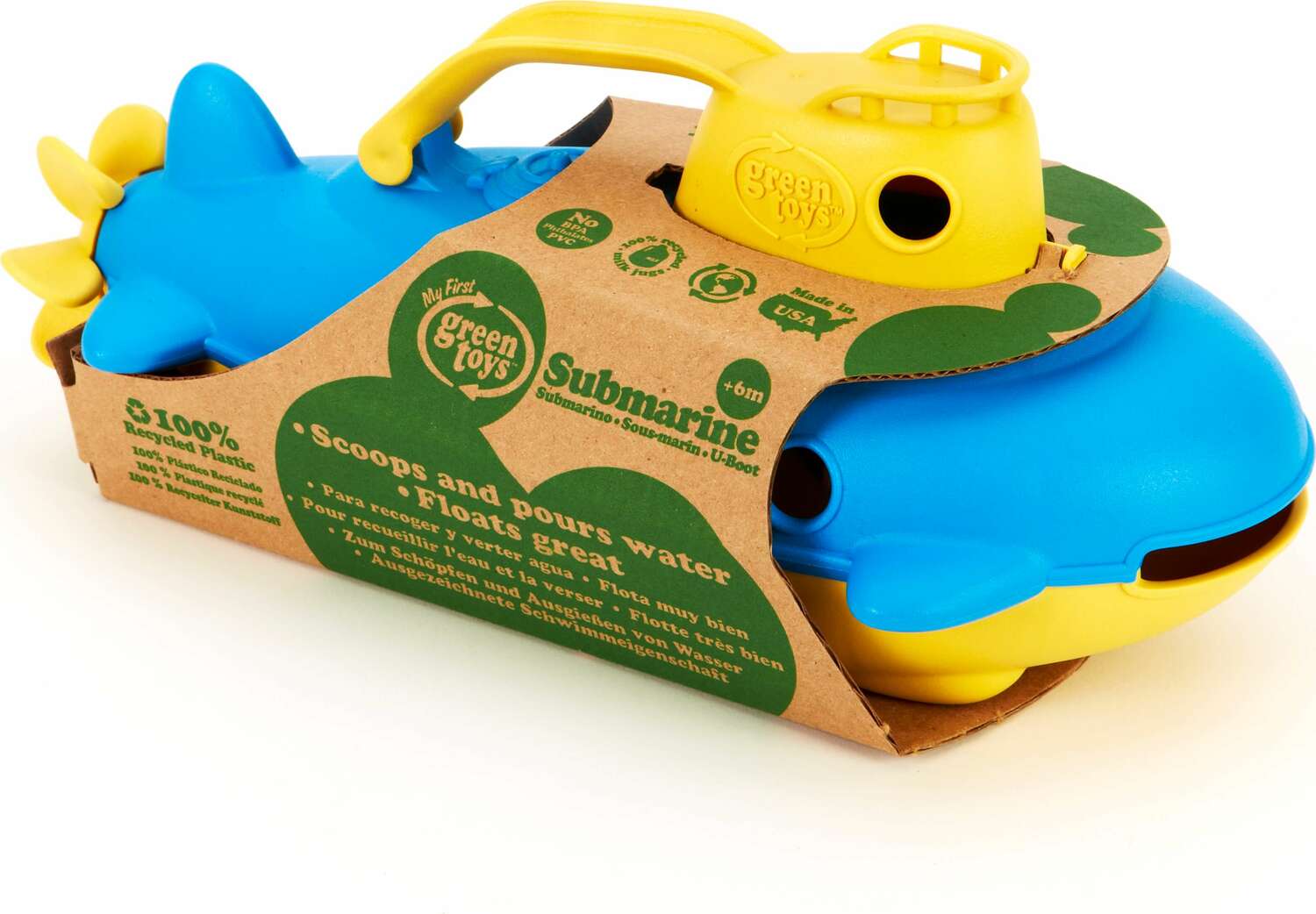 Take the helm of the My First Green Toys Submarine for a nautical journey to help protect the planet! Submerge it underwater to explore the terrain at the bottom of the tub, and let it resurface to scan the horizon in search of the next earth-friendly adventure. Made in the USA from 100 recycled plastic milk jugs that save energy and reduce greenhouse gas emissions, this sturdy watercraft features a spinning rear propeller, a flat bottom for added stability, and the classic handle and wide-mouth opening combination for plenty of scoop-and-pour fun. The cabin can be opened for easy cleaning, while the whole vessel is also dishwasher safe. No BPA, phthalates, PVC or external coatings, and also meets FDA food contact standards. Packaged with recycled and recyclable materials and printed with soy inks. Recommended for ages 6 months and up. Dimensions: 10.5"l x 5.5"W x 4"H.