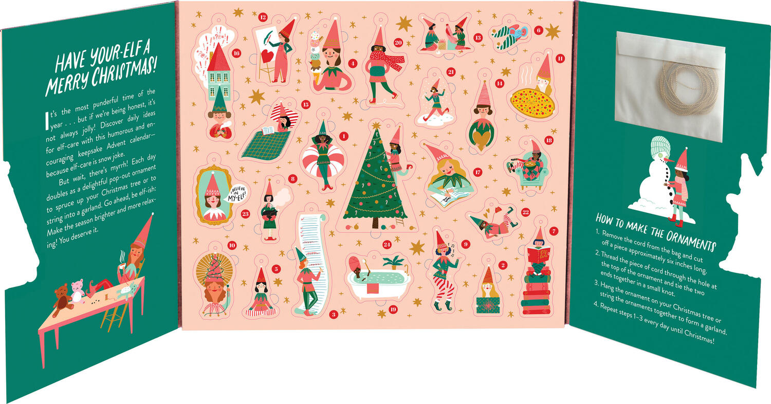 Advent calendar combines the spirit of the season with self-care—er, elf-care. Count down the days to Christmas with 24 whimsical, seasonal ideas for staying jolly and relaxed through the stress of the holidays. Go for a walk . . . or a dash! Buy or make your-elf a gift. Have a silent night. Each day of this keepsake calendar doubles as a pop-out ornament to spruce up your Christmas tree or string on a garland using the included gold cord. Printed on responsibly sourced paper.